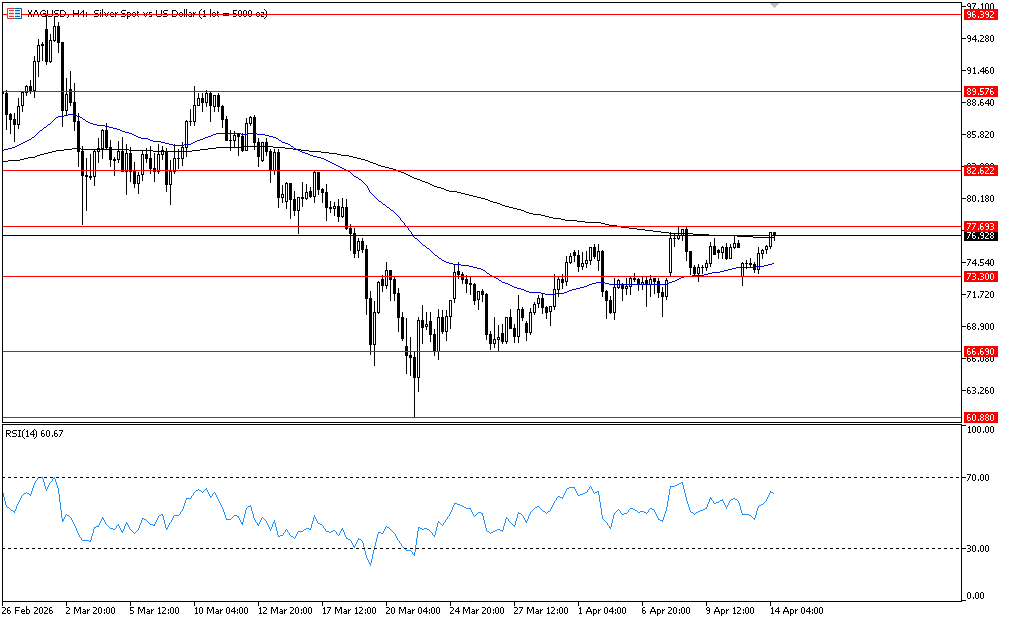 تتحرك الفضة في اتجاه صاعد على اطار الاربع ساعات, ويتداول حول مستوى 82.50 الذي يمثل مستوى دعم افقي على اطار الاربع ساعات, وباختراقه يدعم استمرار الاتجاه الصاعد واستهداف مستوى 89.45 ثم 95.60, ويظهر مؤشر القوة النسبية احتمالات الاستمرار في الاتجاه الصاعد بتحركه بين مستوى 50 و 70.