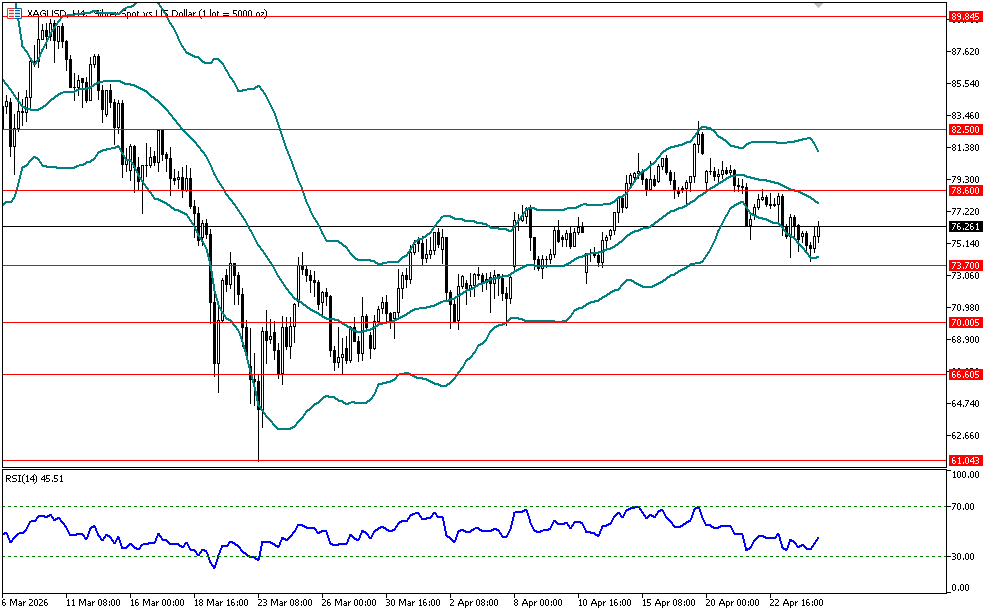 تتحرك الفضه في اتجاه صاعد على اطار الاربع ساعات , وارتد لاعلي من مستوى 73.70 الذي يمثل مستوى دعم افقي على اطار الاربع ساعات, للتصحيح وإعادة اختبار مستوي 78.60 وبالارتداد منه لاسفل يدعم استمرار الاتجاه الهابط واستهداف مستوى 73.70 ثم 70.00. ويظهر مؤشر القوة النسبية احتمالات الاستمرار في الاتجاه الهابط بتحركه اسفل مستوى 50 .