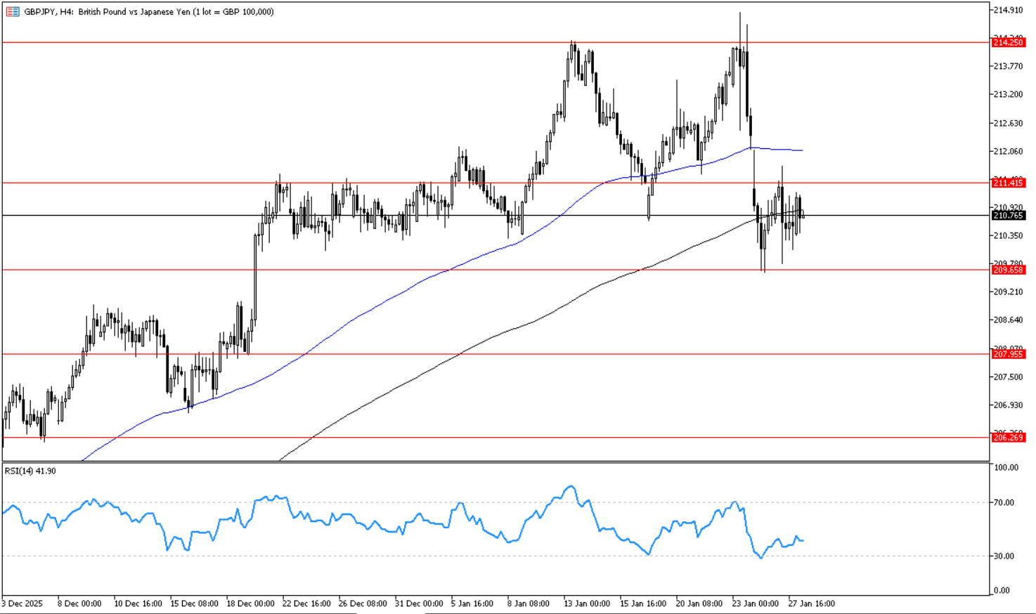 يتحرك الزوج في اتجاه هابط على اطار الأربع ساعات , وارتد لاسفل حول مستوى 211.40 الذي يمثل مستوى مقاومه افقي على اطار الاربع ساعات, ما يدعم استمرار الاتجاه الهابط واستهداف مستوى 209.65 ثم 207.95. ويظهر مؤشر القوة النسبية احتمالات استمرار الاتجاه الهابط بتحركه حول مستوى 40 .