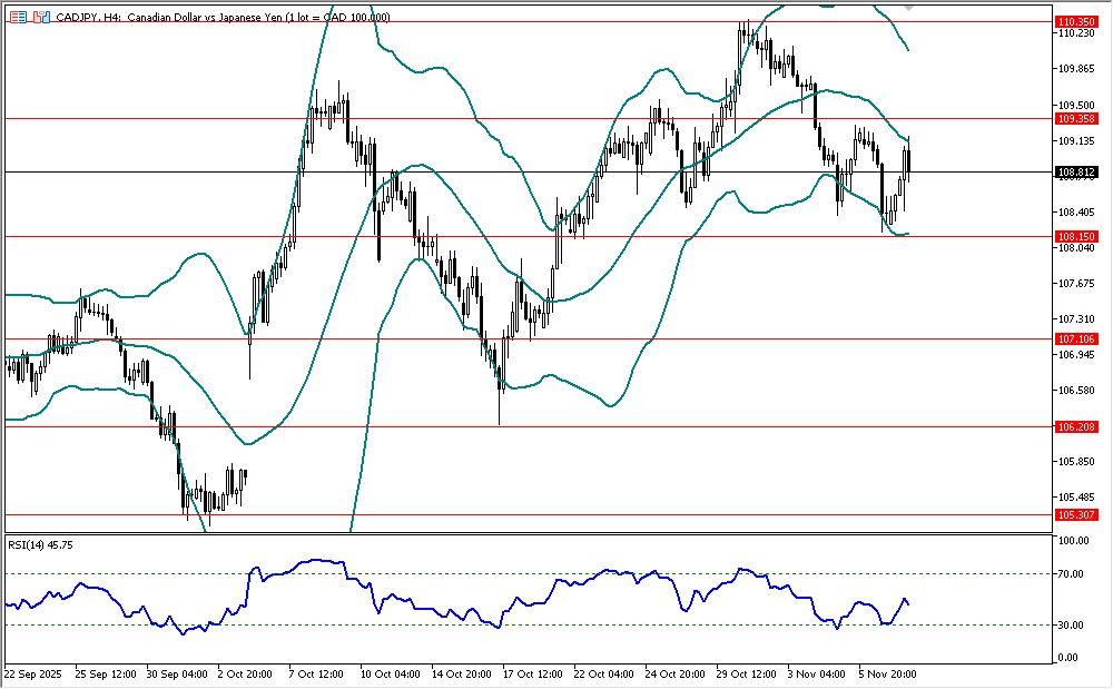 يتحرك الزوج في اتجاه هابط على اطار الاربع ساعات, وارتد لاسفل حول مستوى 109.35 الذي يمثل مستوى دعم افقي على اطار الاربع ساعات, ما يدعم استمرار الاتجاه الهابط واستهداف مستوى 108.15 ثم 107.10. ويظهر مؤشر القوه النسبيه احتمالات استمرار الاتجاه الهابط بارتداده لاسفل حول مستوي 50.