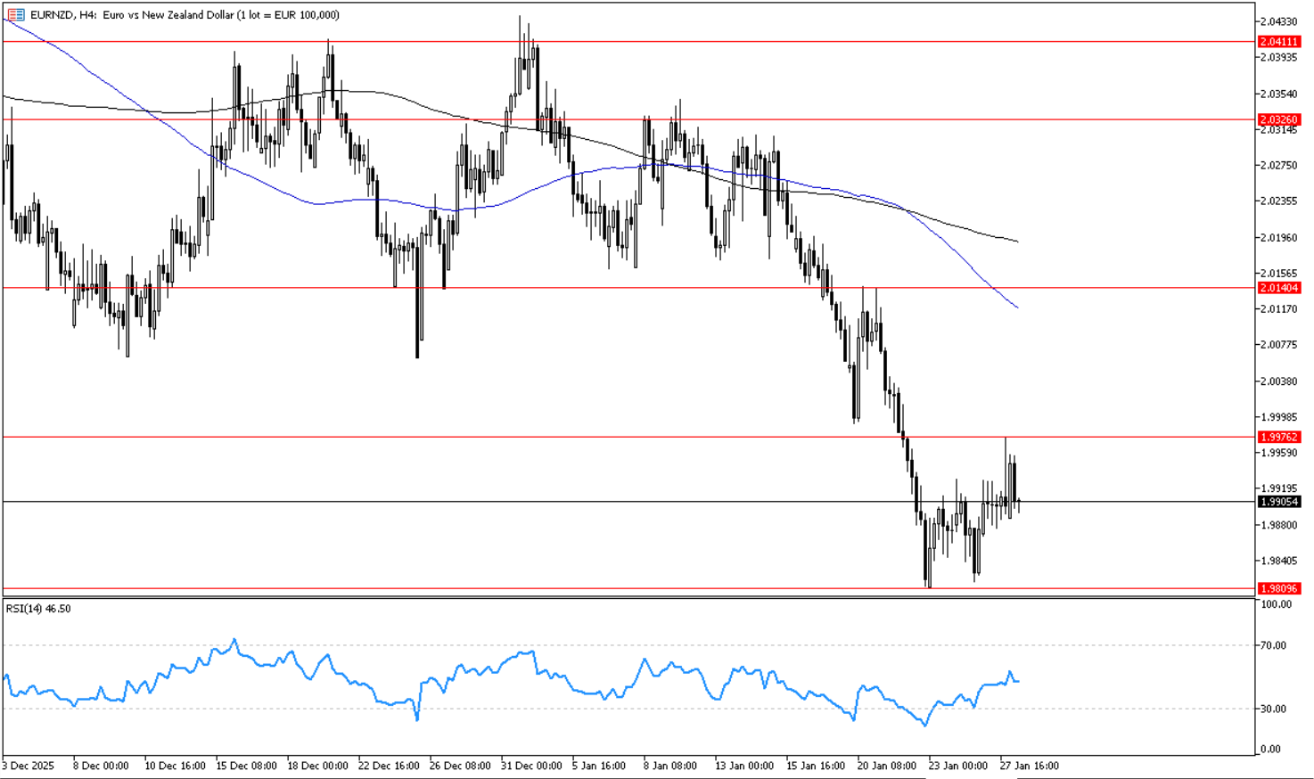 يتحرك الزوج في اتجاه هابط على اطار الاربع ساعات, وارتد لاسفل حول مستوى 1.9975 الذي يمثل مستوى مقاومه افقي على اطار الاربع ساعات, ما يدعم استمرار الاتجاه الهابط واستهداف مستوى 1.9810 ثم 1.9765. ويظهر مؤشر القوة النسبية احتمالات استمرار الاتجاه الهابط بارتداده لاسفل حول مستوى 50.