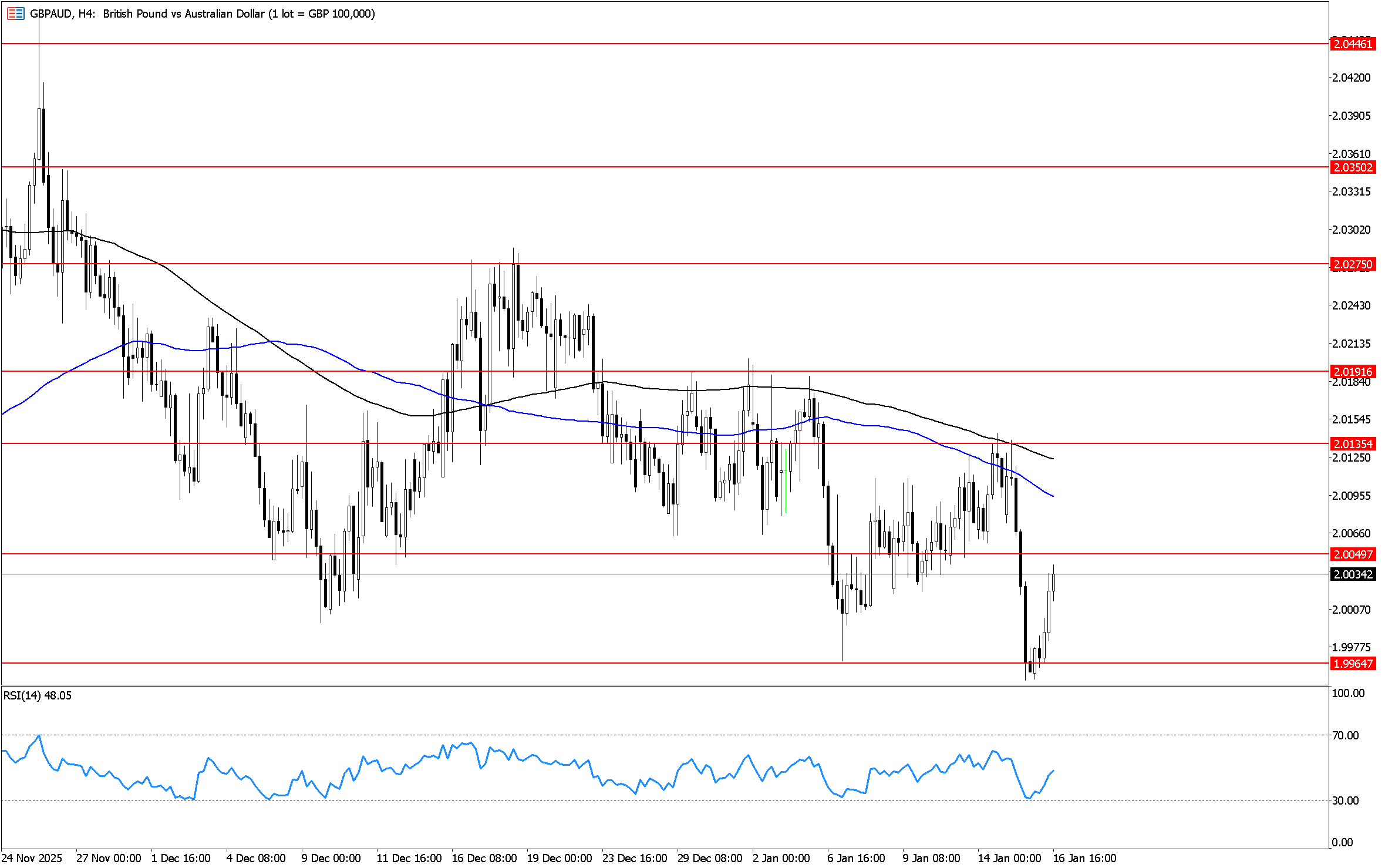 يتحرك الزوج في اتجاه هابط على اطار الاربع ساعات, ويتداول حول مستوى 2.0060 الذي يمثل مستوى مقاومة افقي على اطار الاربع ساعات, وبالارتداد منه لاسفل يدعم استمرار الاتجاه الهابط واستهداف مستوى 1.9960 ثم 1.9890 . و يظهر مؤشر القوة النسبية احتمالات استمرار الاتجاه الهابط بتحركه اسفل مستوى 50 .