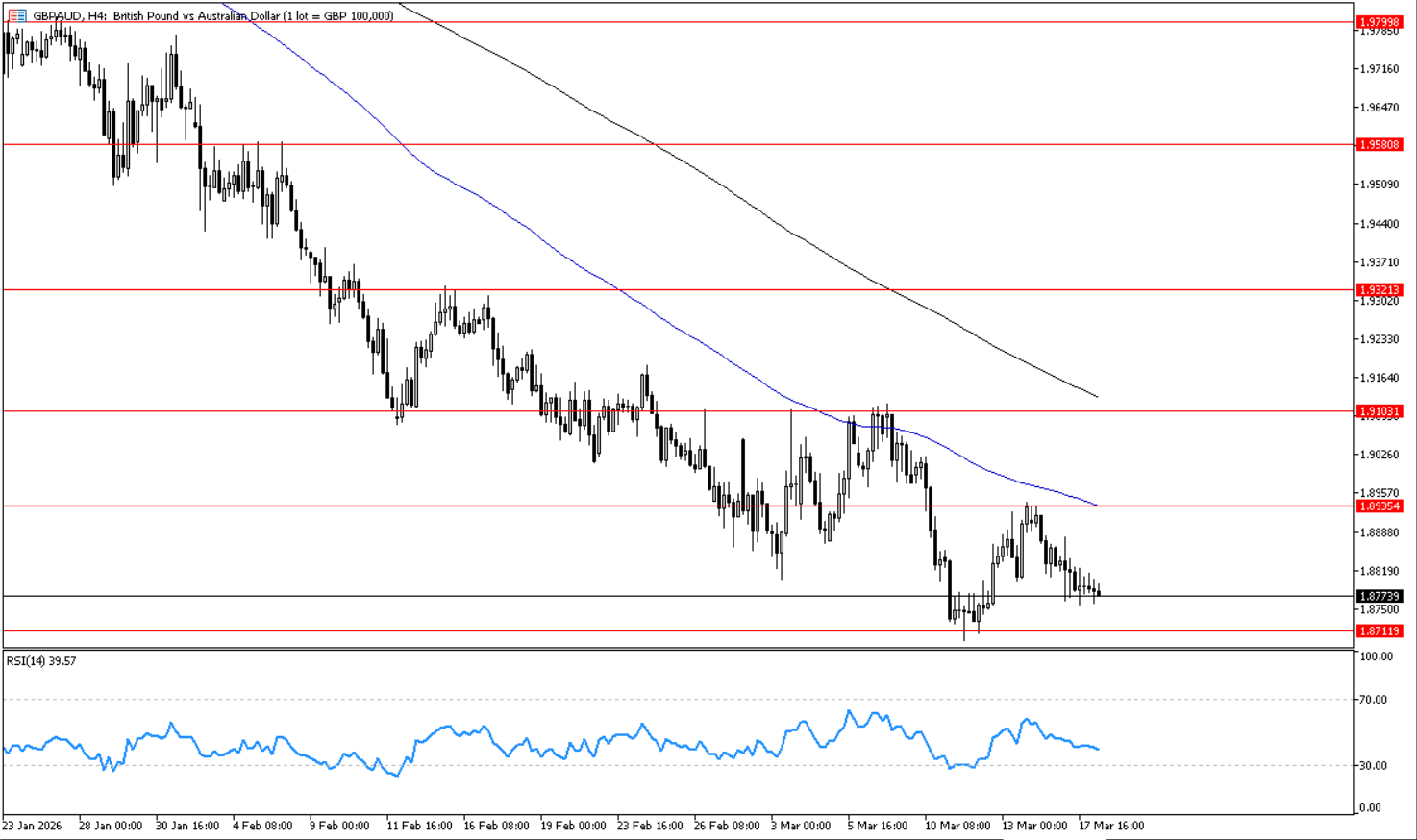 يتحرك الزوج في اتجاه هابط على إطار الاربع ساعات, وارتد لاسفل حول مستوى 1.8940 الذي يمثل مستوى مقاومه افقي على اطار الاربع ساعات, ما يدعم استمرار الاتجاه الهابط واستهداف مستوى 1.8710 ثم 1.8590. ويظهر مؤشر القوة النسبية احتمالات استمرار الاتجاه الهابط باتداده لاسفل حول مستوى 60 .