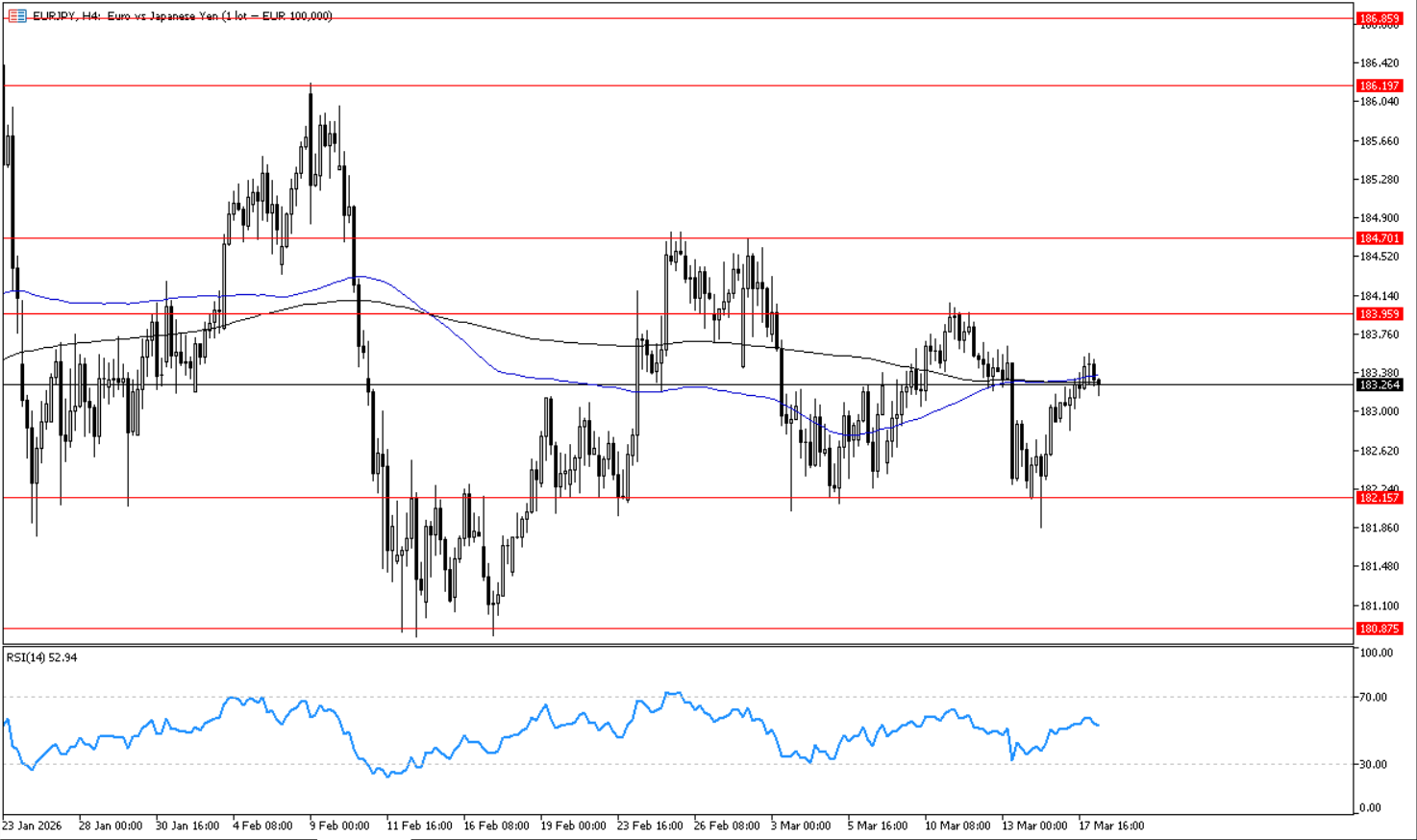 يتحرك الزوج في حركه عرضيه على اطار الأربع ساعات, وارتد لاعلي حول مستوى 182.15 الذي يمثل مستوى دعم افقي على اطار الاربع ساعات, ما يدعم استمرار الحركه العرضيه واستهداف مستوى 184.00 ثم 184.75. ويظهر مؤشر القوة النسبية احتمالات استمرار الحركه العرضيه بتحركه اعلي مستوى 50.