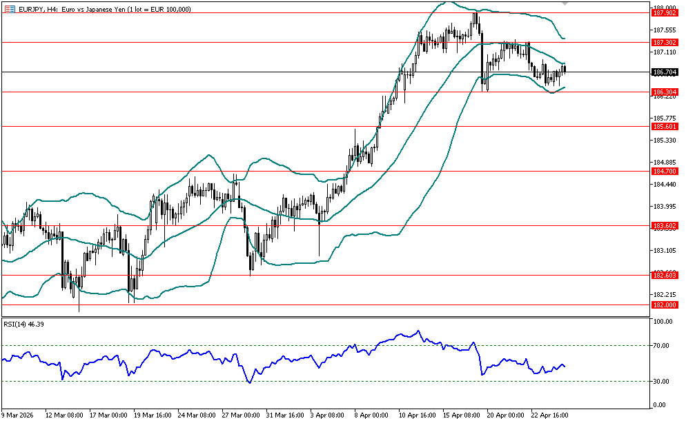يتحرك الزوج في اتجاه صاعد على إطار الاربع ساعات، وارتد لاعلي حول مستوى 186.30 الذي يمثل مستوى دعم افقي على إطار الاربع ساعات، ما يدعم استمرار الاتجاه الصاعد واستهداف مستوي 187.30 ثم 187.90. ويظهر مؤشر القوة النسبية احتمالات استمرار الاتجاه الصاعد بارتداده لاعلي حول مستوي 40 .
