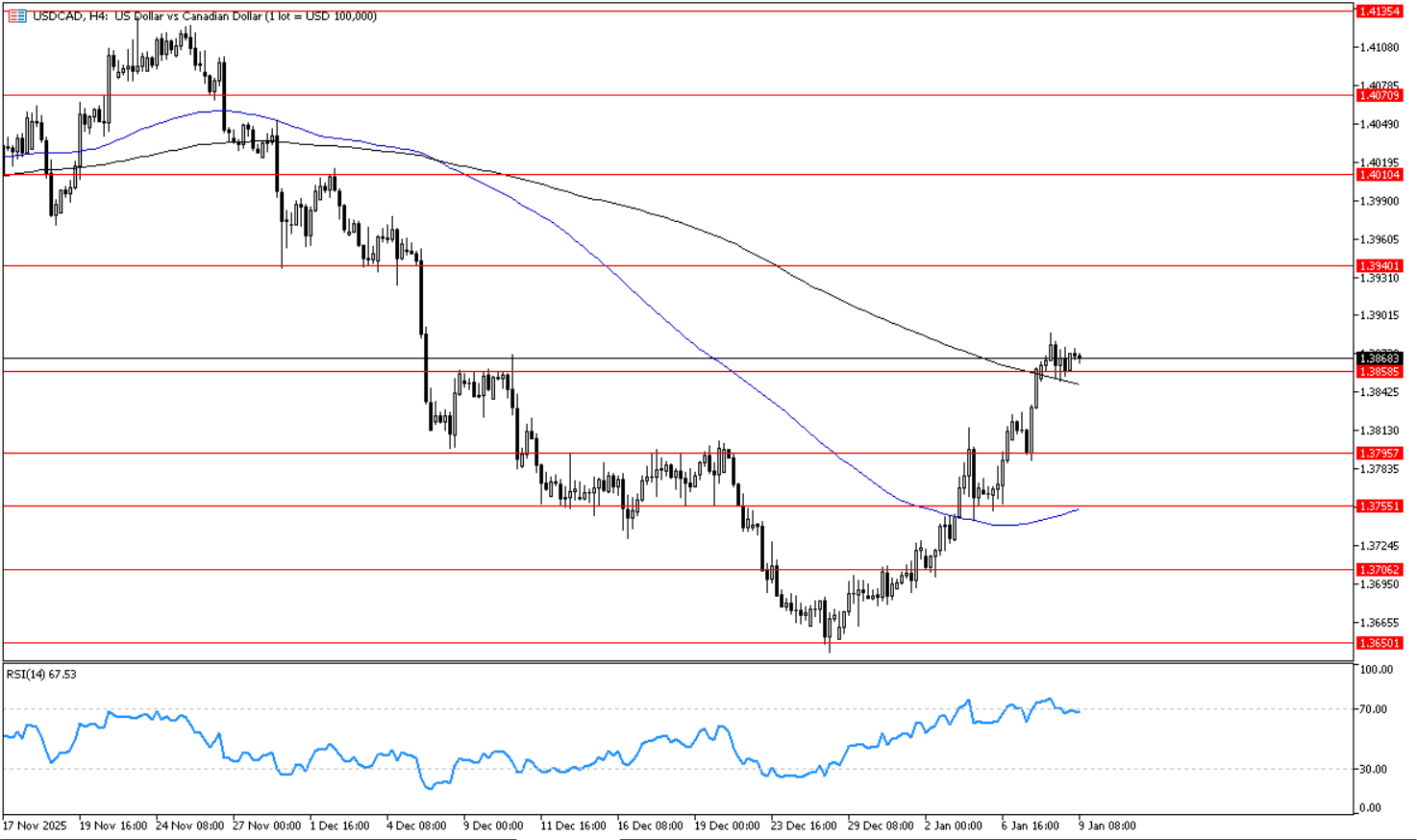 يتحرك الزوج في اتجاه صاعد على اطار الاربع ساعات, ويتداول حول مستوى 1.3860 الذي يمثل مستوى دعم افقي على اطار الاربع ساعات, ما يدعم استمرار الاتجاه الصاعد واستهداف مستوى 1.3940 ثم 1.4010. ويظهر مؤشر القوه النسبيه احتمالات استمرار الاتجاه الصاعد بتحركه بين مستوي 50 و70.