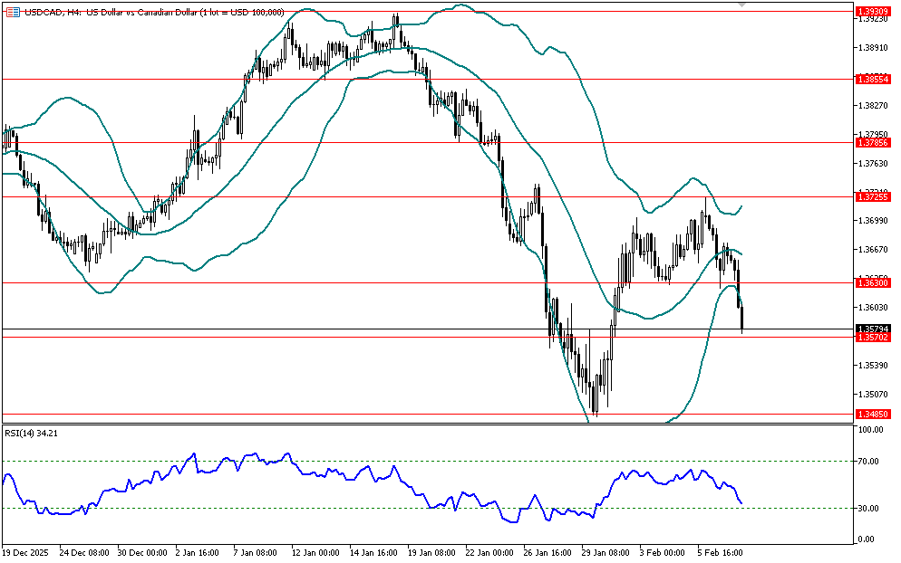 يتحرك الزوج في اتجاه هابط على اطار الأربع ساعات, ويتداول حول مستوى 1.3570 الذي يمثل مستوى دعم افقي على اطار الاربع ساعات, حيث بكسره يدعم استمرار الاتجاه الهابط واستهداف مستوى 1.3485 ثم 1.3420. ويظهر مؤشر القوة النسبية احتمالات استمرار الاتجاه الهابط بارتداده لاسفل من حول مستوى 50.
