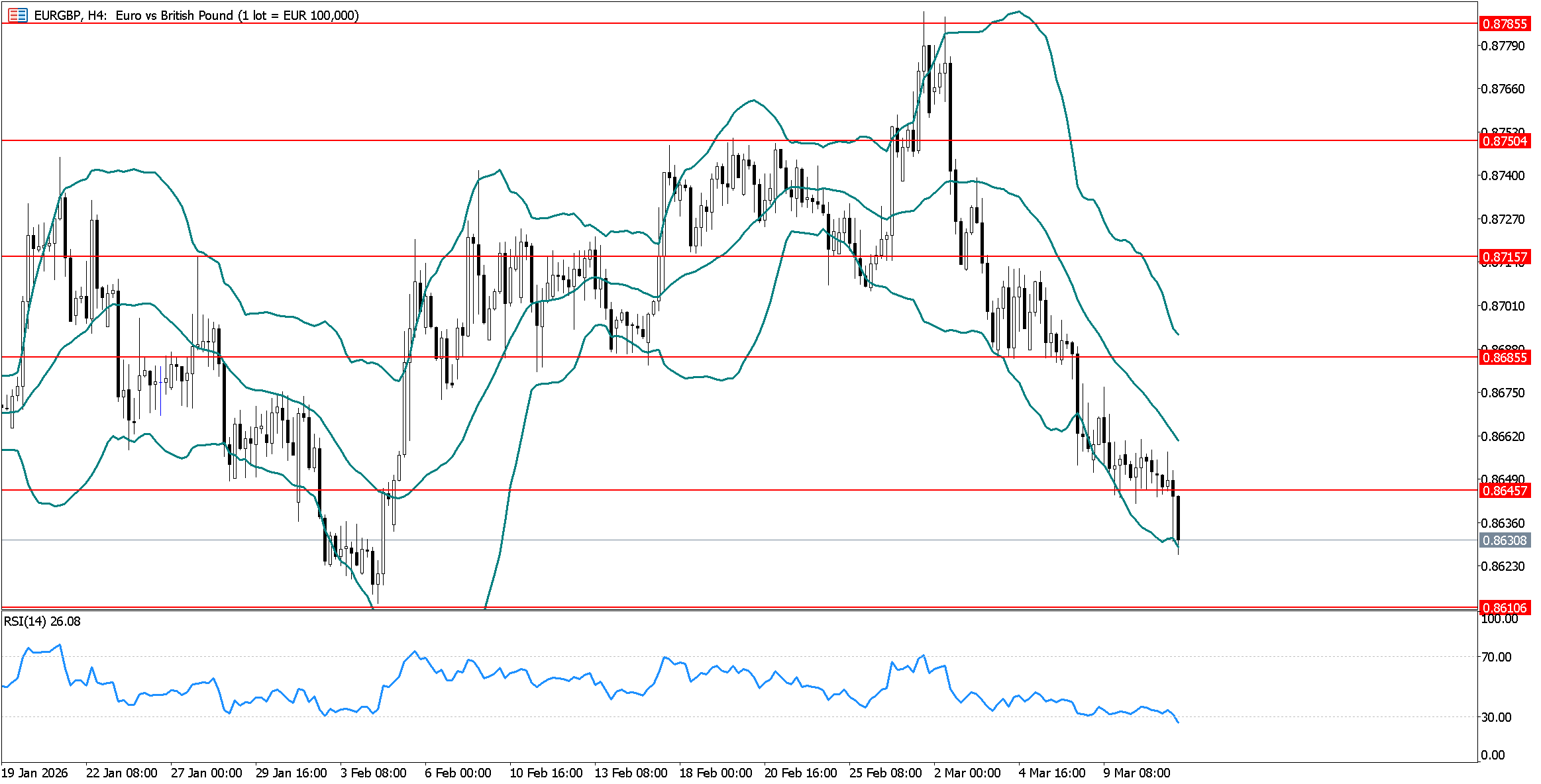 يتحرك الزوج في اتجاه هابط على اطار الأربع ساعات. وكسر مستوى 0.8645 الذي كان يمثل مستوى دعم افقي على اطار الاربع ساعات, ما يدعم استمرار الاتجاه الهابط واستهداف مستوى 0.8610 ثم 0.8570. ويظهر مؤشر القوة النسبية احتمالات استمرار الاتجاه الهابط بتحركه بين مستوي 50 و 30.