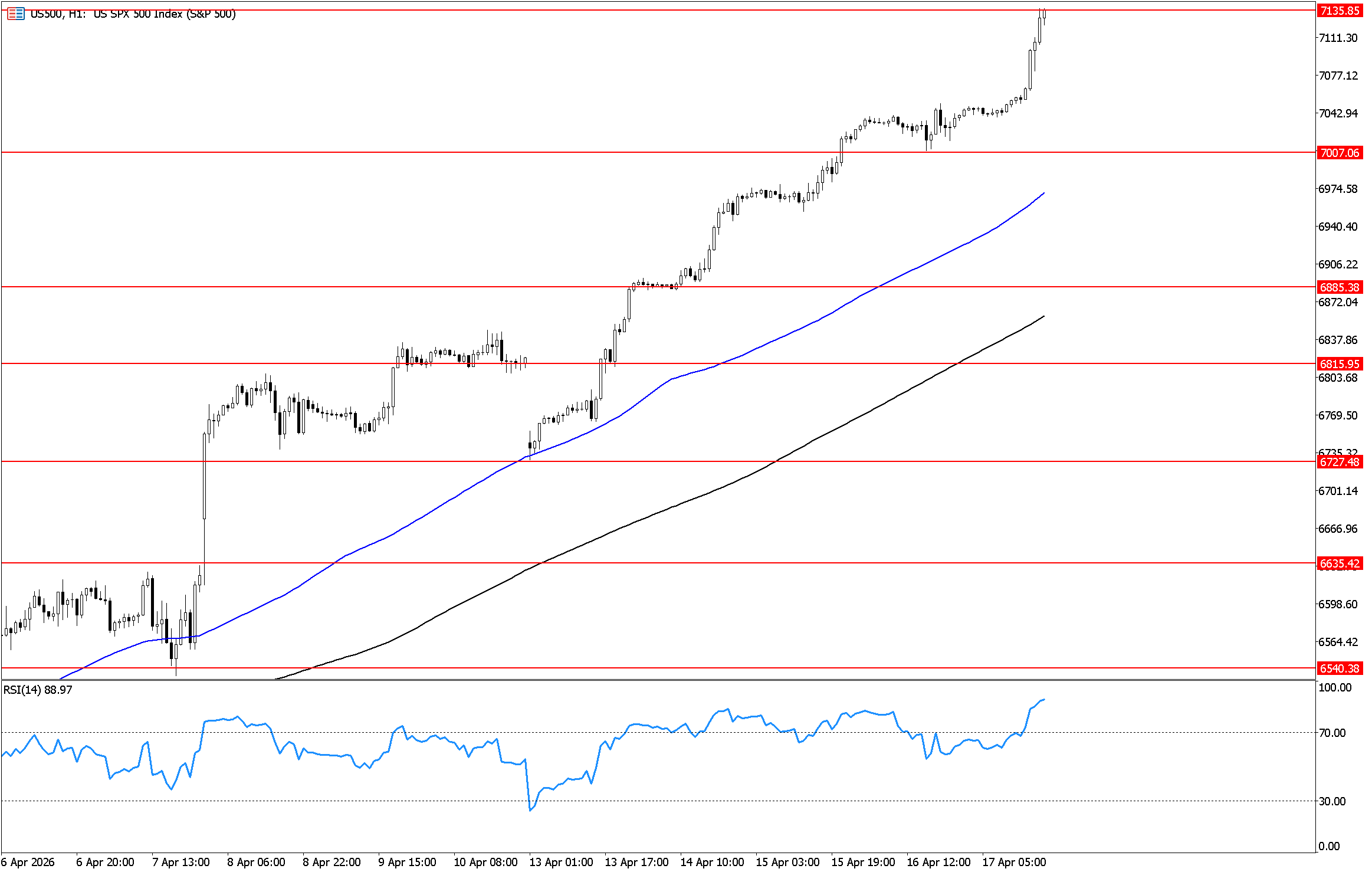 يتحرك المؤشر في اتجاه صاعد على اطار الساعة, ويتداول حول مستوى 7135 الذي يمثل مستوى مقاومة افقي على اطار الساعة, وباختراقه يدعم استمرار الاتجاه الصاعد واستهداف مستوى 7150 ثم 7180, ويظهر مؤشر القوة النسبية احتمالات الارتداد لاسفل للتصحيح قبل الاستمرار في الاتجاه الصاعد بتحركه اعلي مستوى 70 داخل منطقه التشبع الشرائي.