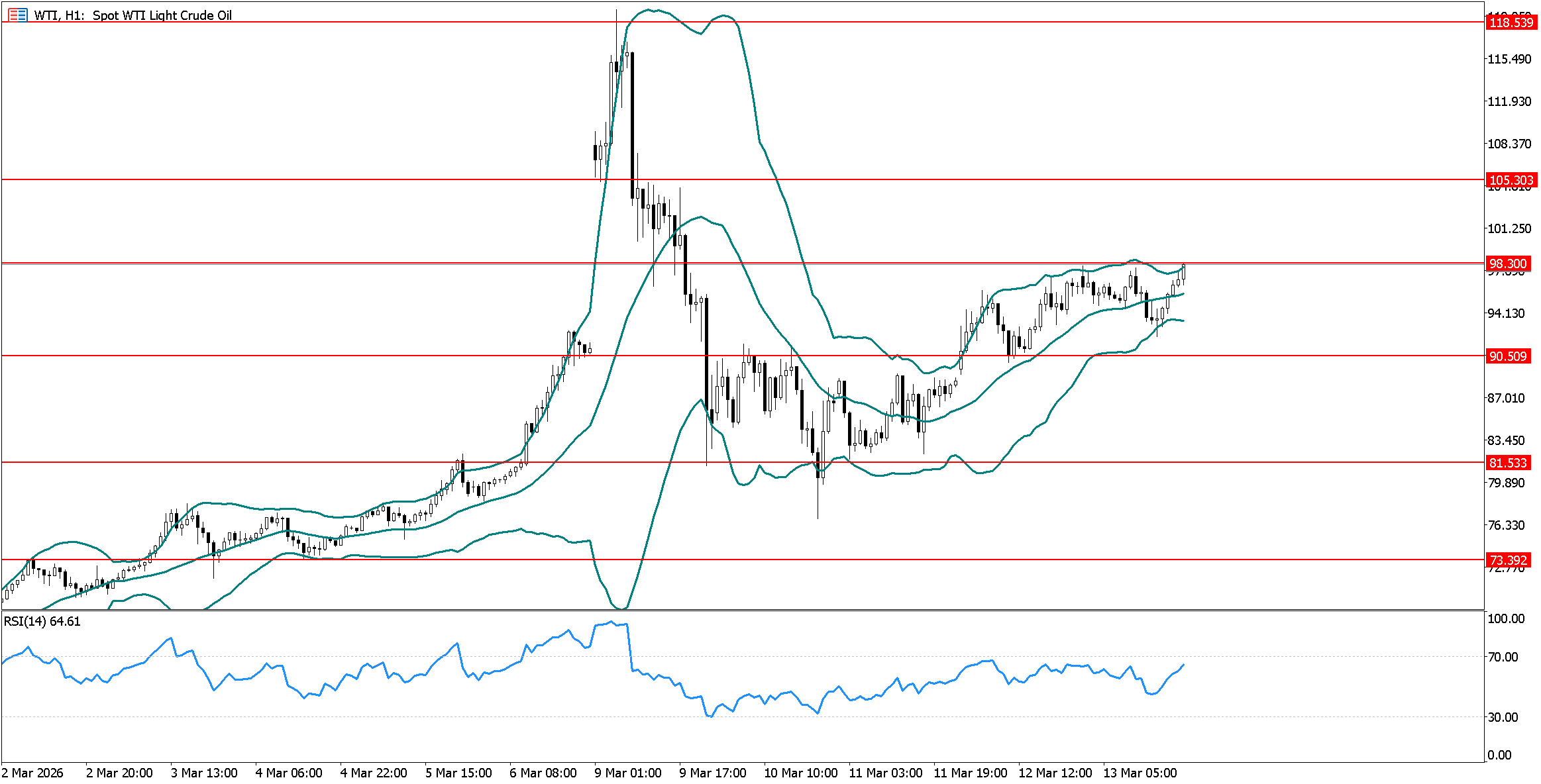 يتحرك الخام الأمريكي الخفيف في اتجاه صاعد على اطار الساعة , ويتداول حول مستوى 60.40 الذي يمثل مستوى مقاومه افقي على اطار الساعة , وباختراقه يدعم استمرار الاتجاه الصاعد واستهداف مستوى 61.40 ثم 61.95. يظهر مؤشر القوة النسبية احتمالات استمرار الاتجاه الصاعد بارتداده لاعلى بالقرب من مستوى 60.