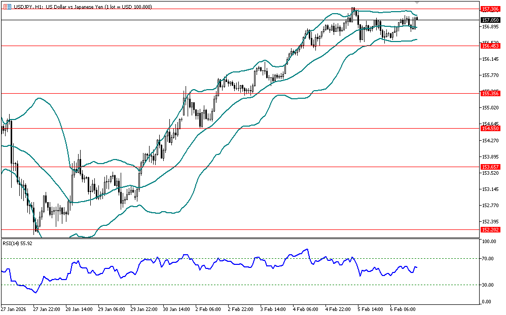 يتحرك الزوج في اتجاه صاعد على اطار الساعة, ويتداول حول مستوى 157.30 الذي يمثل مستوى مقاومة افقي على اطار الساعة, حيث باختراقه يدعم استمرار الاتجاه الصاعد واستهداف مستوى 157.80 ثم 158.50. ويظهر مؤشر القوة النسبية احتمالات استمرار الاتجاه الصاعد بارتداده لاعلي من حول مستوى 50.