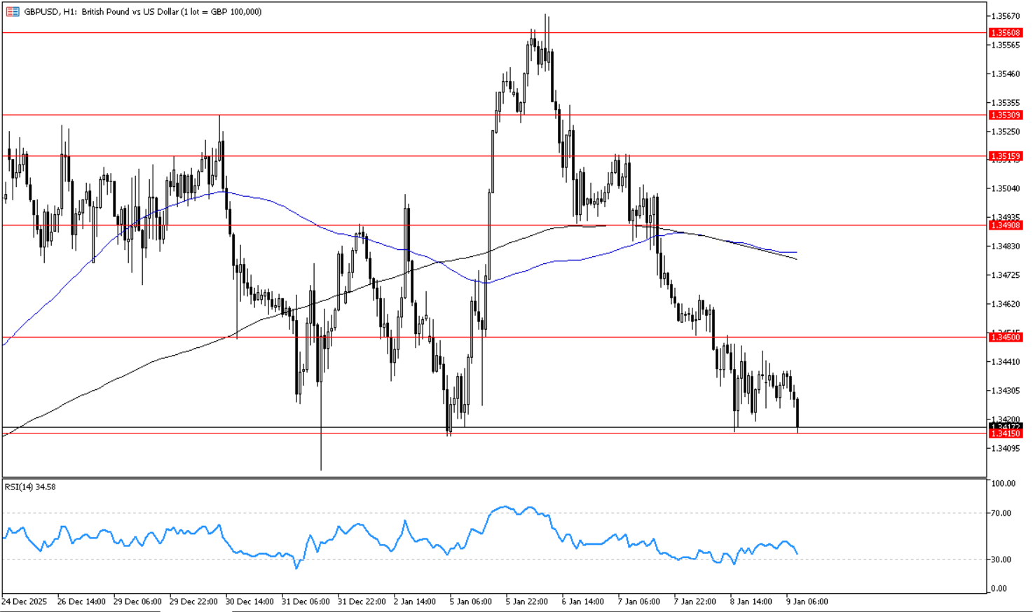 يتحرك الزوج في اتجاه هابط على اطار الساعة, وكسر مستوى 1.3415 الذي كان يمثل مستوى دعم افقي على اطار الساعة, وبالثبات اسفله يدعم استمرار الاتجاه الهابط واستهداف مستوى 1.3355 ثم 1.3310. يظهر مؤشر القوى النسبية احتمالات استمرار الاتجاه الهابط بارتداده لاسفل من حول مستوى 50.
