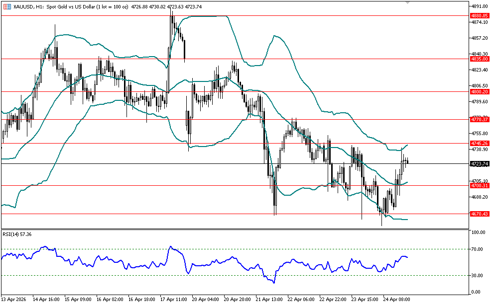 يتحرك الذهب في اتجاه هابط على اطار الساعة, وارتد لاسفل حول مستوى 4745 الذي يمثل مستوى مقاومة افقي على اطار الساعة, ما يدعم استمرار الاتجاه الهابط واستهداف مستوى 4700 ثم 4670. يظهر مؤشر القوة النسبية احتمالات استمرار الاتجاه الهابط بتحركه حول مستوى 60.