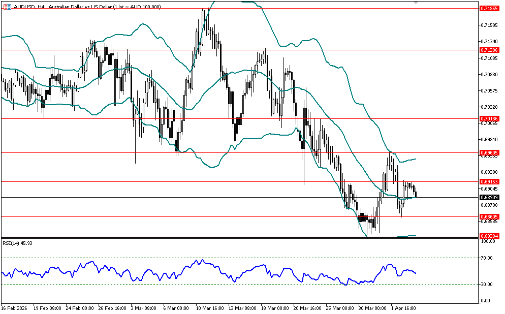 يتحرك الزوج في اتجاه هابط على اطار الأربع ساعات, وارتد لاسفل من مستوى 0.6915 الذي يمثل مستوى مقاومة افقي على اطار الاربع ساعات, ما يدعم استمرار الاتجاه الهابط واستهداف مستوي 0.6860 ثم 0.6830. ويظهر مؤشر القوة النسبية احتمالات استمرار الاتجاه الهابط بارتداده لاسفل من مستوى 50.